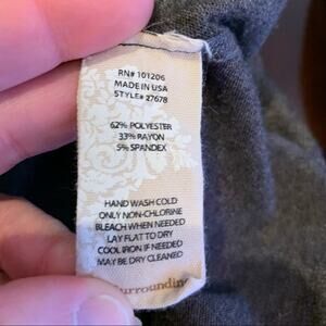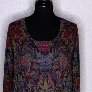 Soft Surroundings multicolor floral knit top. Pullover style with scoop neckline. Long sleeves. Asymmetrical hemline. Multicolor maroon purple green gold floral pattern. Size Medium. Excellent preowned conditon. Minor wash wear. Polyester rayon spandex.