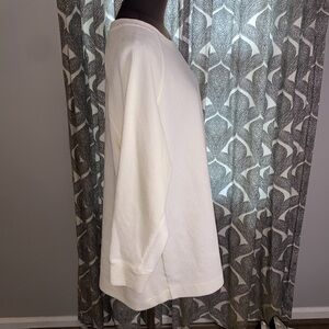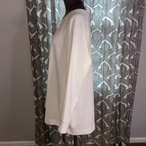Soft and comfortable off white velour tunic top. Perfect for lounging around. Size 1X. In excellent pre loved condition. Measures 24” across the chest, 32” long & has 26” long sleeves.
