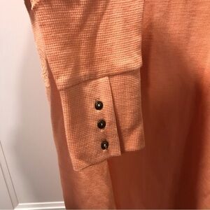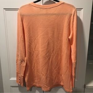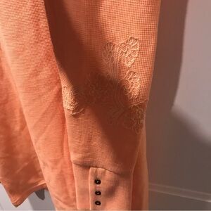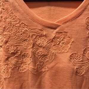 NWOT, never worn. Soft Surroundings peach long sleeve waffle knit top with lace. Appliqué details on the front and sleeve. 3 button cuffs. V neckline. Sz medium