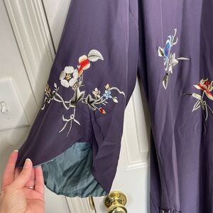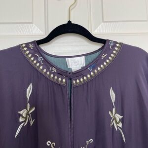 This 100% silk Soft Surroundings robe is a luxurious, bohemian-inspired garment with an artisanal feel. The deep plum base is adorned with intricate floral embroidery in earthy tones—reds, blues, greens, and neutrals—creating a rich, decorative look. The relaxed silhouette features wide sleeves with a hint of contrasting teal lining, and the hem and front placket are bordered with embellished trim for added texture and visual interest.