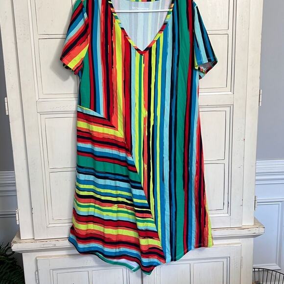 Soft Surroundings size large colorful dress in perfect condition. Measures 20” from armpit to armpit. 22” across the waist and it is about 41” long. Asymmetrical hem.