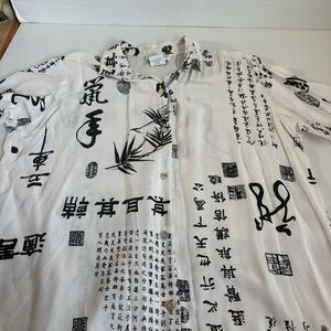 Soft Surroundings white and black button down blouse tunic Asian Chinese script