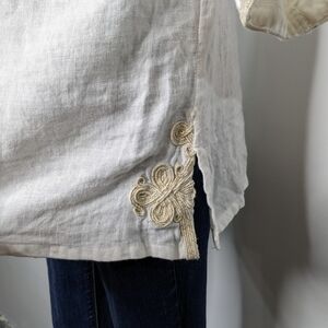 Soft Surroundings white gold v neck linen tunic top S. Button loop was mended (see photo)