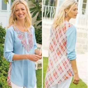 Soft Surroundings Blue Work of Heart Embroidered Chambray Tunic Blouse Size PM