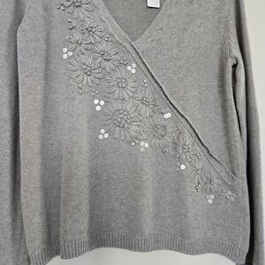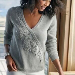 Soft Surroundings Gray V-Neck Embellished Floral Embroidered Sweater Size Small