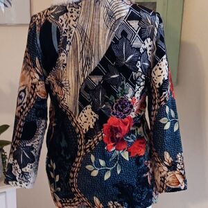 Envelop yourself in the coziness of this beautiful jacket. It has an abstract design on the softest velvet and a faux shearling lining. Pockets. Very retro inspired. Size PXS measures 38 at chest, 42 at bottom hem. 22-inch sleeves. 27 long from shoulder to hem. So very cool in the warmest way.