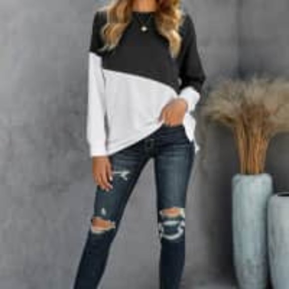 This color block sweatshirt is stylish and effortless! Easy pull-over style and goes with any good pair of jean