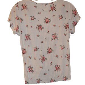 Soft Tender Corduroy Texture Fabric White Red-Green Floral V-Neck Tie-Down Top S