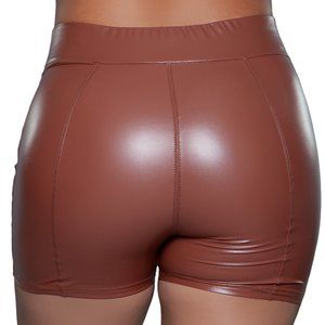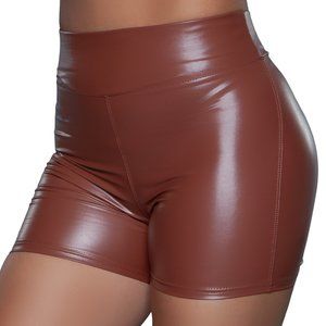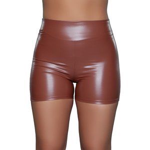 High waisted soft vinyl shorts, pull on style. Brown. New in package. 100% Polyester.