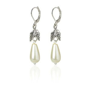 Soft White Glass Pearl Teardrop Antique Silver Leaves Dangle Leverback Earrings