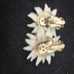 These vintage clip on earrings feature 1.25" D white soft plastic flower petals with pink rhinestone centers