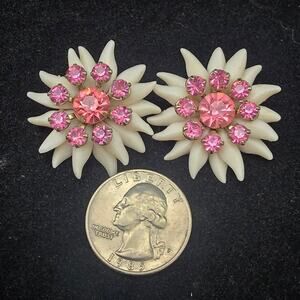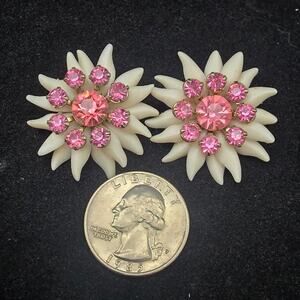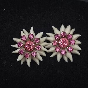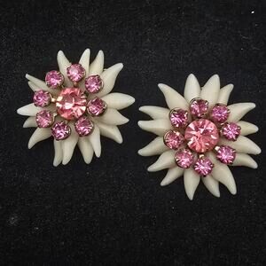 Soft White Plastic Flower Clip On Earrings with Pink Rhinestones Vintage Jewelry