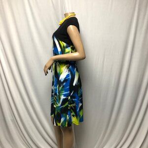 This Soft Works dress features a vibrant abstract print with a classic black cap sleeve design. The waist tie adds a flattering touch, enhancing the silhouette. Ideal for a polished and stylish look in professional or semi-formal settings.