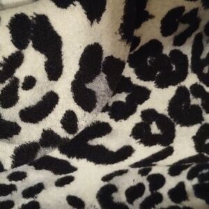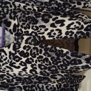 Cute leopard print jacket, constructed of a soft, fleece-like material (like you're wearing your jammies!!). Two button, open front. Roomy and comfy, the jacket naturally floats away from the body for a figure-flattering look. 3/4 length sleeves.