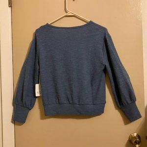 Soft and Comfy Ribbed Blue Top with Suplice Design. Slight Balloon Sleeves with Long Cuffs. Measures 18-1/2" to 20-1/2" p2p, 20" long. Very Stretchy. NWT.