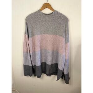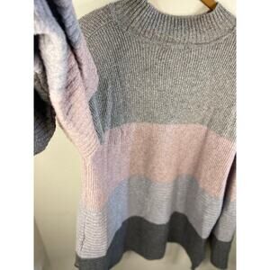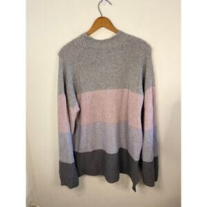 Oversized stretchy and cosy soft sweater with no noteworthy flaws. Please review all photos to fully understand condition and confirm size. Long sleeve winter sweater, long sleeve crew neck sweater, Pink, purple, and grey stripes, gray stripes. Pastel colors.