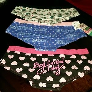 Soft and confy teenagers panties set. With Message and print, size small. 80% cotton, 13% polyamide and 7% Elastane.