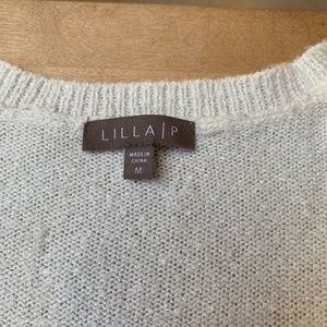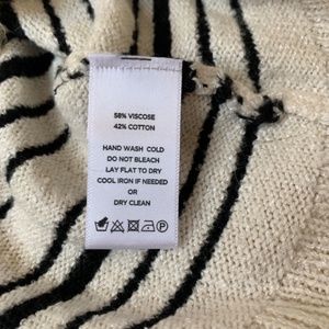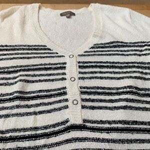 Cream colored sweater with cute black striped pattern. V-neck with snap detail in the front. This sweater by Lilla P is both cozy soft and silky, with a nice drape and not too chunky of a knit. It has a nice, subtle sheen. Size medium.