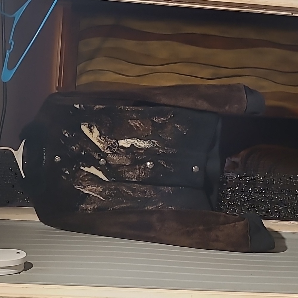 size medium fleece coat brown with dark brown collar and around the bottom of sleeves button up used by on good condition very pretty a and warm