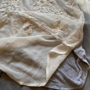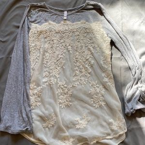 perfect mix of casual and elegant. size XS but fits more like a small/medium. the front has two layers, one of lace and the other of sheer softness. the back and sleeves are thin cotton blend. both the body of the shirt and the sleeves start with a fitted cut and bell out the tiniest bit, making this unbelievably comfortable.