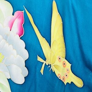 Super soft and lustrous teal blue silk caftan with bright floral and butterfly print. One size