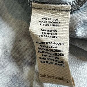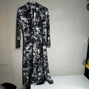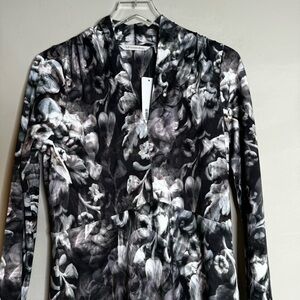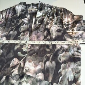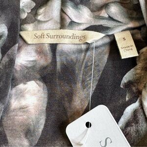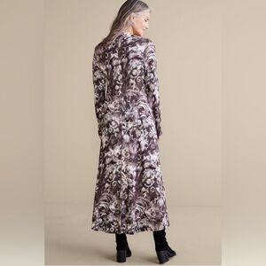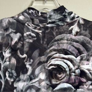 Moody florals with touches of rose, blush, and mint top the wonderfully soft fabric of this knit dress. Shirring at the neck and shoulders adds architectural interest to the V-neckline, while angled waist seams and a full skirt create a chic silhouette