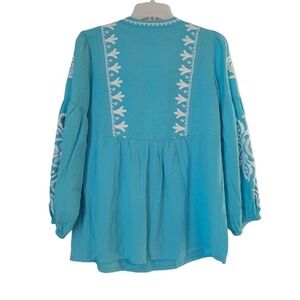 Soft surroundings, beautiful bright turquoise blue blouse with white embroidery around neck and shoulder line.