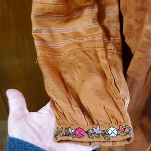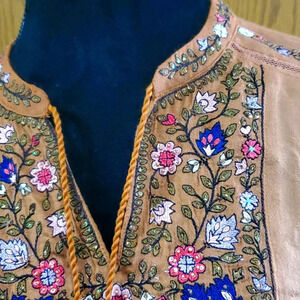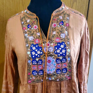 new with out tags tassles still wrapped and extra sequin bag attached beautiful warm brown with bright embroidered floral tunic top by soft surroundings size medium