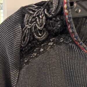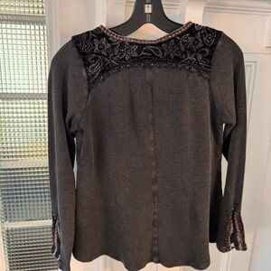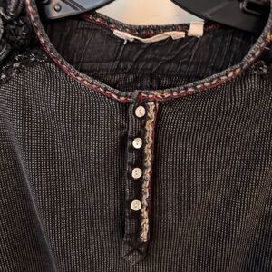 Excellent condition. Women’s soft surroundings long sleeve black wash top. Long sleeves with embroidered and ruffled cuffs, 4 button round neck, embroidered trim & 100% cotton. Size Small Petite. See photos for measurements