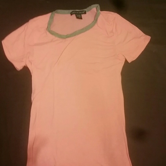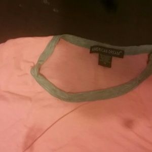 Pink with a gray scoop neck line. Very soft. Very comfortable