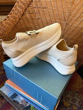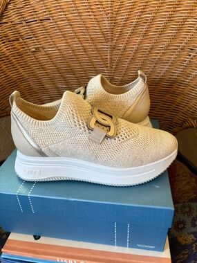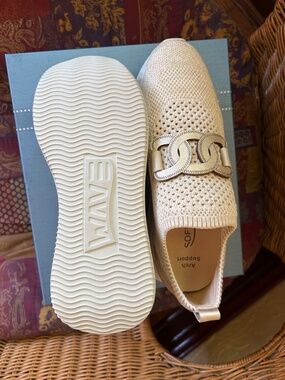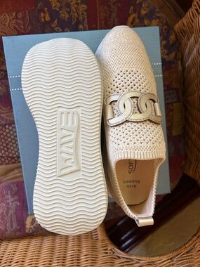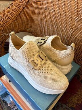 Comfy Softwaves Wave slip-on sneakers. These are a pretty cream/gold knit with cool metallic detail. The official color is sand/platino Has arch support for extra comfort. New, never worn. Size 38.5 (8 US). $295 new.