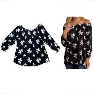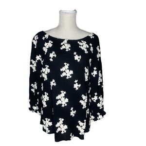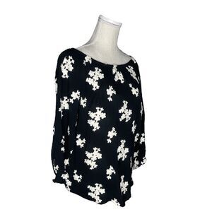 Soft Surroundings Avignon Top. Features black with white embroidered floral appliqué. Peasant style top with puff sleeves. Can be worn off or on the shoulders. 100% rayon. Hand wash. Measurements in pictures.