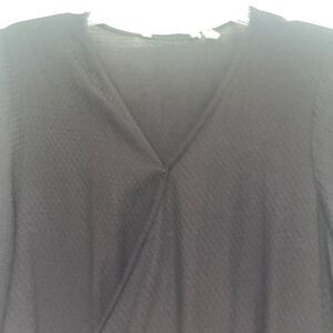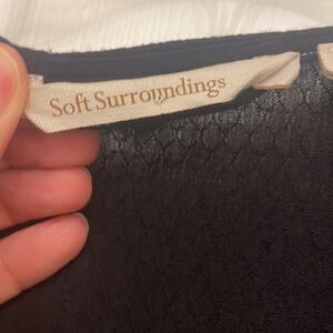 Soft Surroundings Black Patterned Jumpsuit with Cut out Sleeves & Pom Pom Trim, size medium. Elastic waist. Snap for top of the v neck. Excellent used condition. Care & content tags in photos.