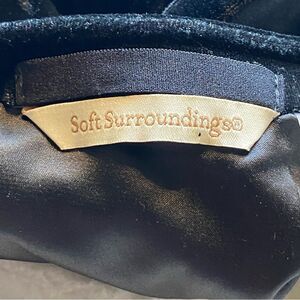 Soft Surroundings Black Velour Moto Jacket Size Medium. Excellent used condition. Asymmetrical front zipper. Snaps at neck. 2 zipper pockets. Fully lined. Measures chest 37", length 23", sleeve 24".