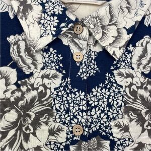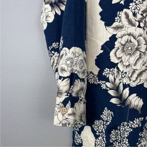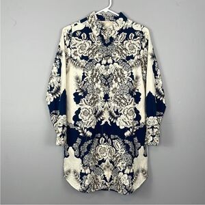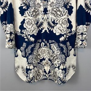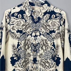 Soft Surroundings St. Remy long button down floral tunic top. Size small. In good preowned condition. No stains. Cream, gray, and navy blue floral pattern. Button down. Button sleeves. Has pockets. Armpit to pit measures 19 inches. Top of shoulder down 32 inches. Comes from a smoke free home.
