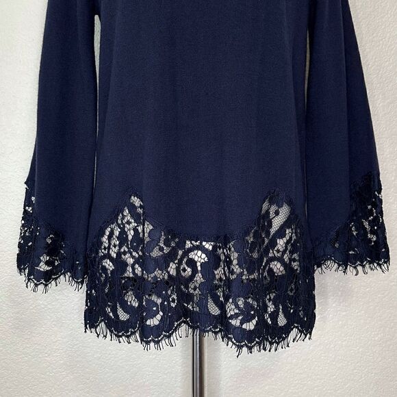 - Wide lace border at the bottom hem and on the long bell sleeves