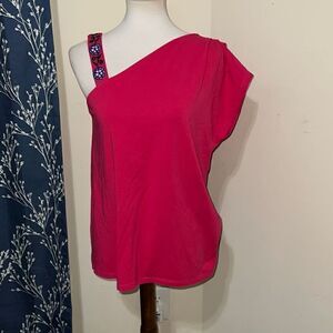 Good, preloved condition. Soft Surroundings Asymmetrical Sleeve Embroidered Flower Top Blouse. One sleeve with pleated detail. Sleeveless one side. Strap has embroidered flower detail.