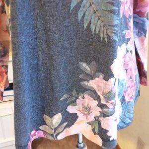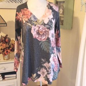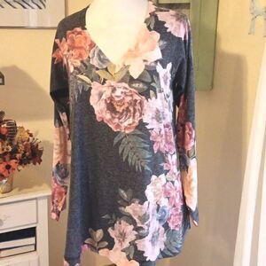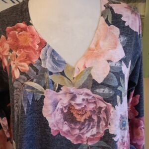 This top put the soft in Soft Surroundings. Lovely floral on a gray background. Long, flared at bottom. Size L measures 42 at chest, 62 at bottom hem, 30 long from shoulder to hem. Sleeves 25 long. Really pretty and like NEW.