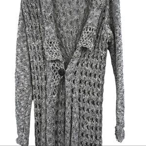 This airy crochet cardigan is an open front, one button style that falls into an easy a line with fold over collar and gathers in the back.