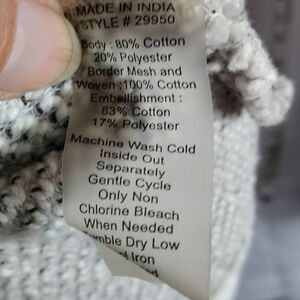 Cream sweater with gray fibers, bottom of hem and sleeves have mesh and embroidered lace design. Drop shoulders. Chest 19", length 27". AA