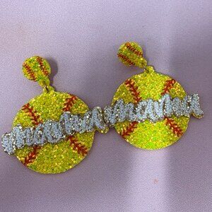 Step up to the plate in style! 🥎✨ These handmade earrings feature a bold yellow softball design with red stitching and shimmering “Mama” script across the front. Perfect for showing off your softball spirit whether you’re cheering from the stands or out on the town.
