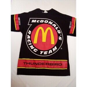 Crafted for the ultimate NASCAR fan, this vintage Softee T-Shirt celebrates the iconic McDonald's Racing team from 1995. Emblazoned with the number 94 and the image of a sleek Thunderbird, this piece pays homage to one of the sport's legendary drivers, Bill Elliott. Made in the USA, it represents a slice of racing history.