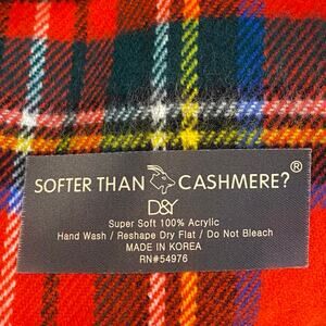 Softer Than Cashmere, tartan scarf, red plaid scarf, fringe scarf, winter accessory, classic tartan, cold weather style, unisex scarf, cozy layering, holiday fashion, vintage inspired, soft acrylic, fall winter essential, Scottish plaid, preppy style