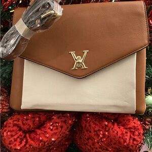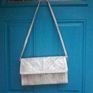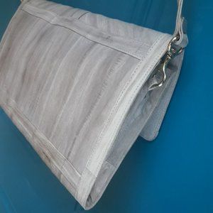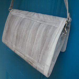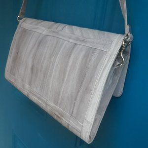 Softest Leather Vintage Handbag Purse Clutch with Strap Genuine Leather Bag in flat rectangle foldover magnetic snap and 5 interior pockets with several zipper pockets. Detachable strap and fabulous creamy soft leather and some suede interior. Beautiful patchwork style leather strips. Real leather strap is removabel and can be used on other bags as it has snap clasps so can be changed out or removed all together.