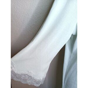 Elegant mint green XL Softies long nightgown with a ribbed cotton and delicate lace detailing along the chest and sleeves. Perfect for comfortable nights, this long-sleeve gown is a stylish sleepwear choice. It measures 42" in length from the top seam of the shoulder to the bottom hem and 20" from pit to pit. Please see all photographs as they are part of the description. Shipped with USPS Ground Mail.