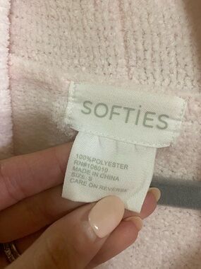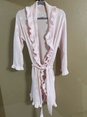Light pink knit robe with feminine ruffle trim. Tie waist for a flattering fit. Soft, cozy texture. Elegant and delicate look.
