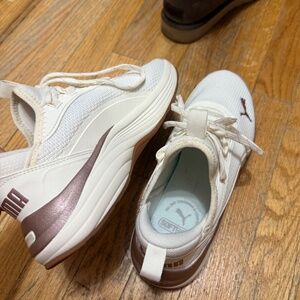 Like new Puma sneakers. They are a creamy white color with rose gold details.