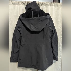 Grey soft shell type women's jacket with a removable hood. Has a stretchy high neck collar, two zippered pockets, and adjustable strings at the waist. Pit to pit measurements laying flat are 20 inches.