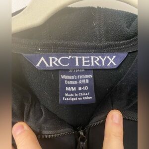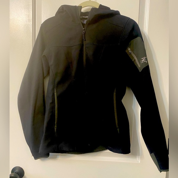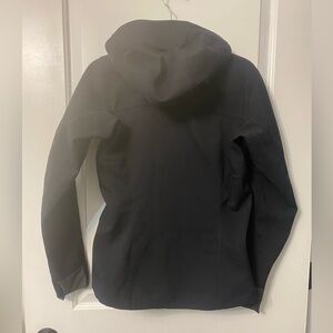 This is a gently used size medium arcteryx soft shell jacket. It’s black with some gray trim. Zipper works great, overall in very good used condition. The hood is helmet compatible, has drawstring.