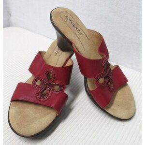 Experience ultimate comfort with these Softspots red sandals, featuring wide straps with decorative buckles and a cushioned footbed for all-day wear. The slip-on design and medium heel make them perfect for casual outings, while the rich red color adds a touch of elegance to any outfit.